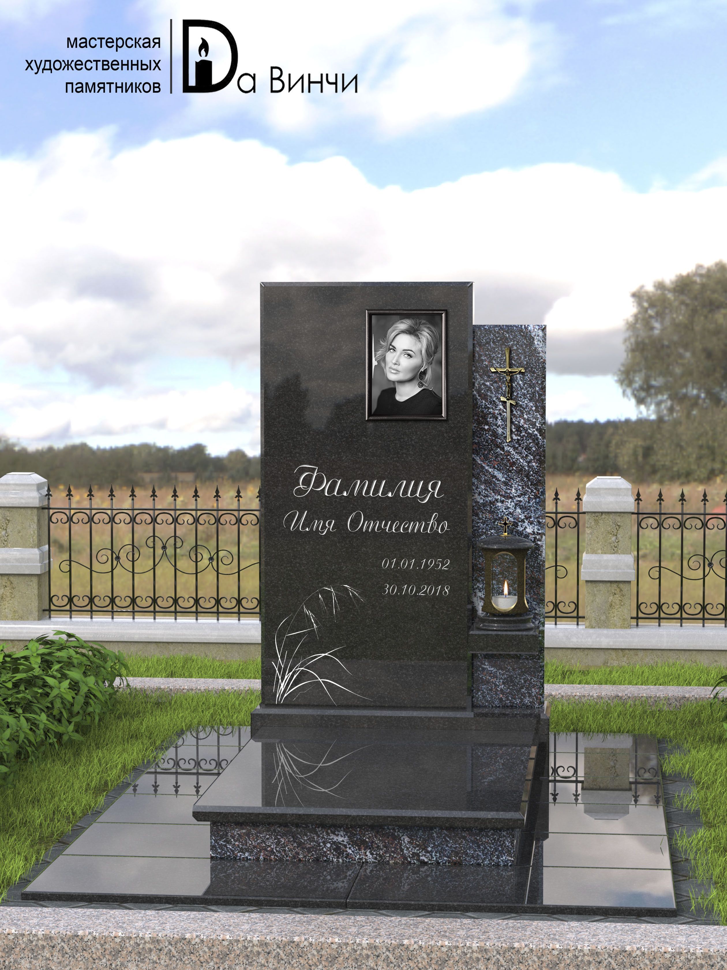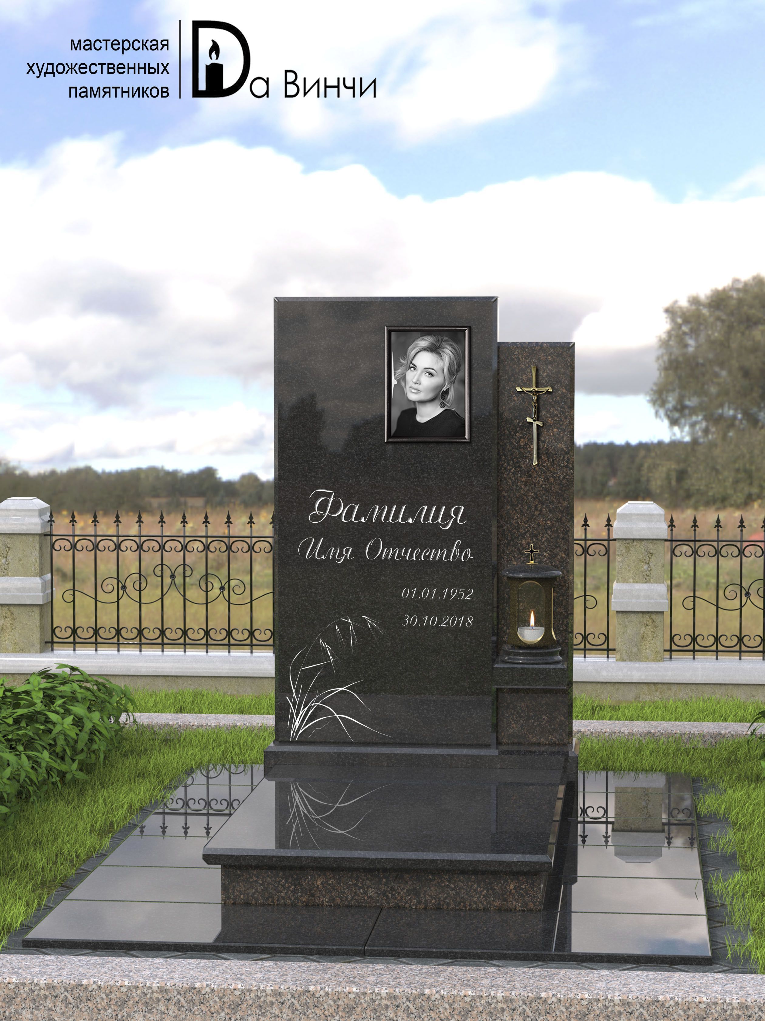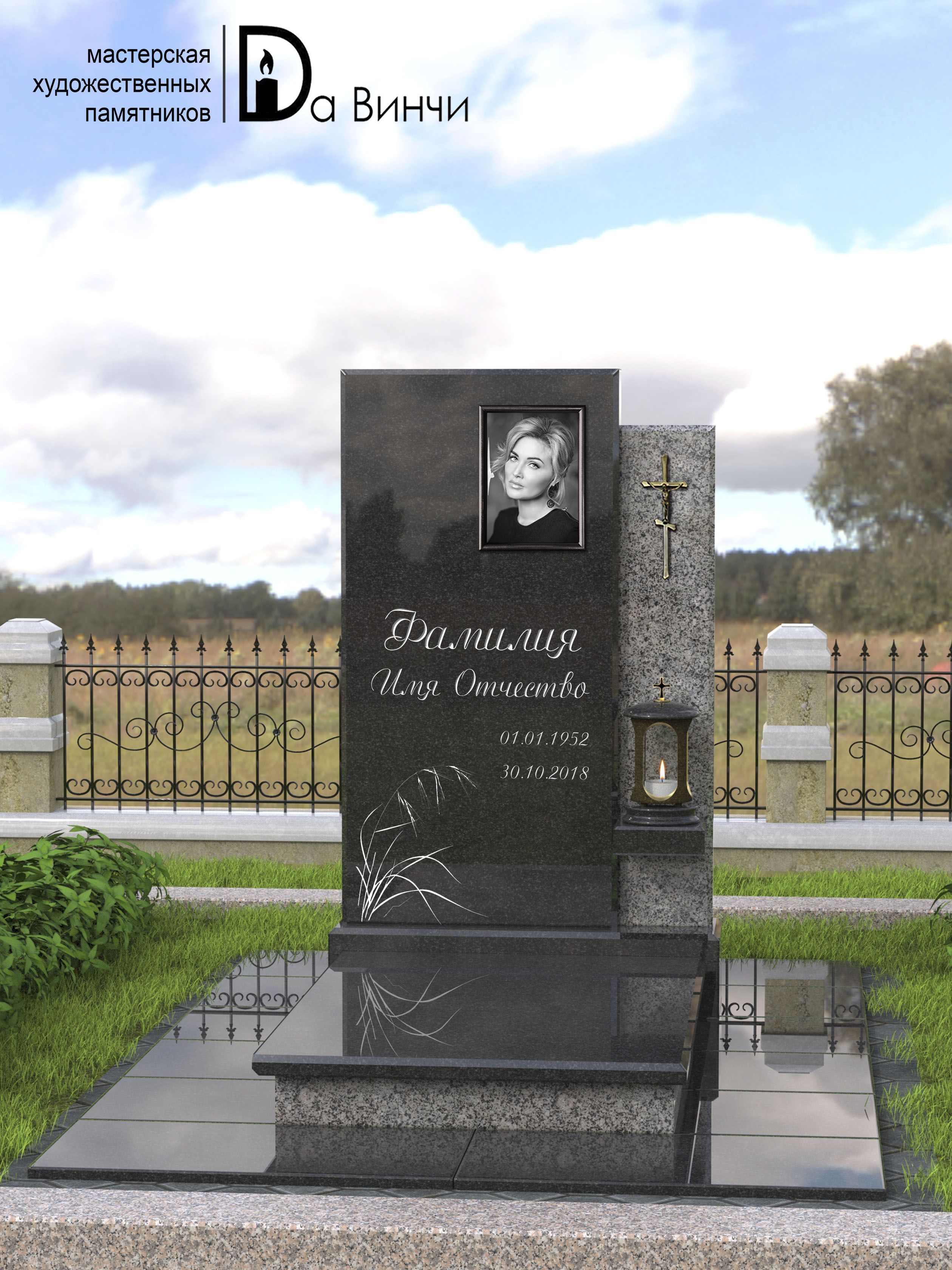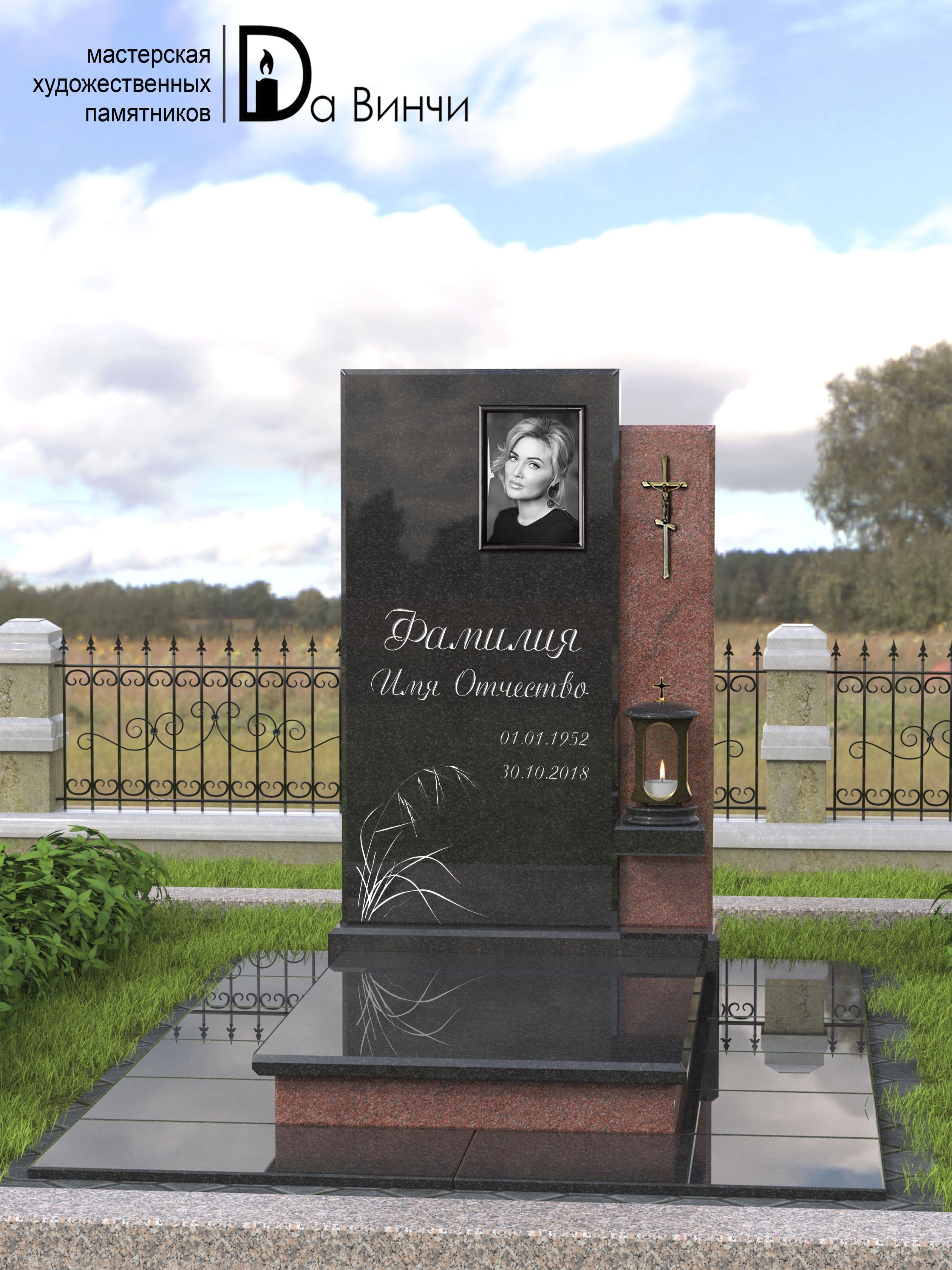 Памятник комбинированный из различных сортов гранита может быть изготовлен во множестве цветовых решений и сочетаний форм и размеров. Композиция составлена из двух прямоугольных стел стоящих на общей подставке с примыкающим к ней цветником. На дополнительную плиту из светлого-красного гранита Питкяранта приклеен бронзовый крест и интегрирована подставка под лампаду. На цветниковых балках установлена надгробная плита с нависанием (капельником). Портретная стела представлена в черном граните Габбро-диабазе, как наиболее универсальном и удобном материале для размещения надписей и портретов. Цветные гранитные элементы предложены из натуральных материалов на выбор, таких как Аврора, Гранатовый Амфиболит, Дымовский, Мансуровский граниты, Балтик грин, Габбро-диабаз, Питкяранта (Сюскюянсаари), гранит «Возрождение» и Казахстанского камня Жельтау.