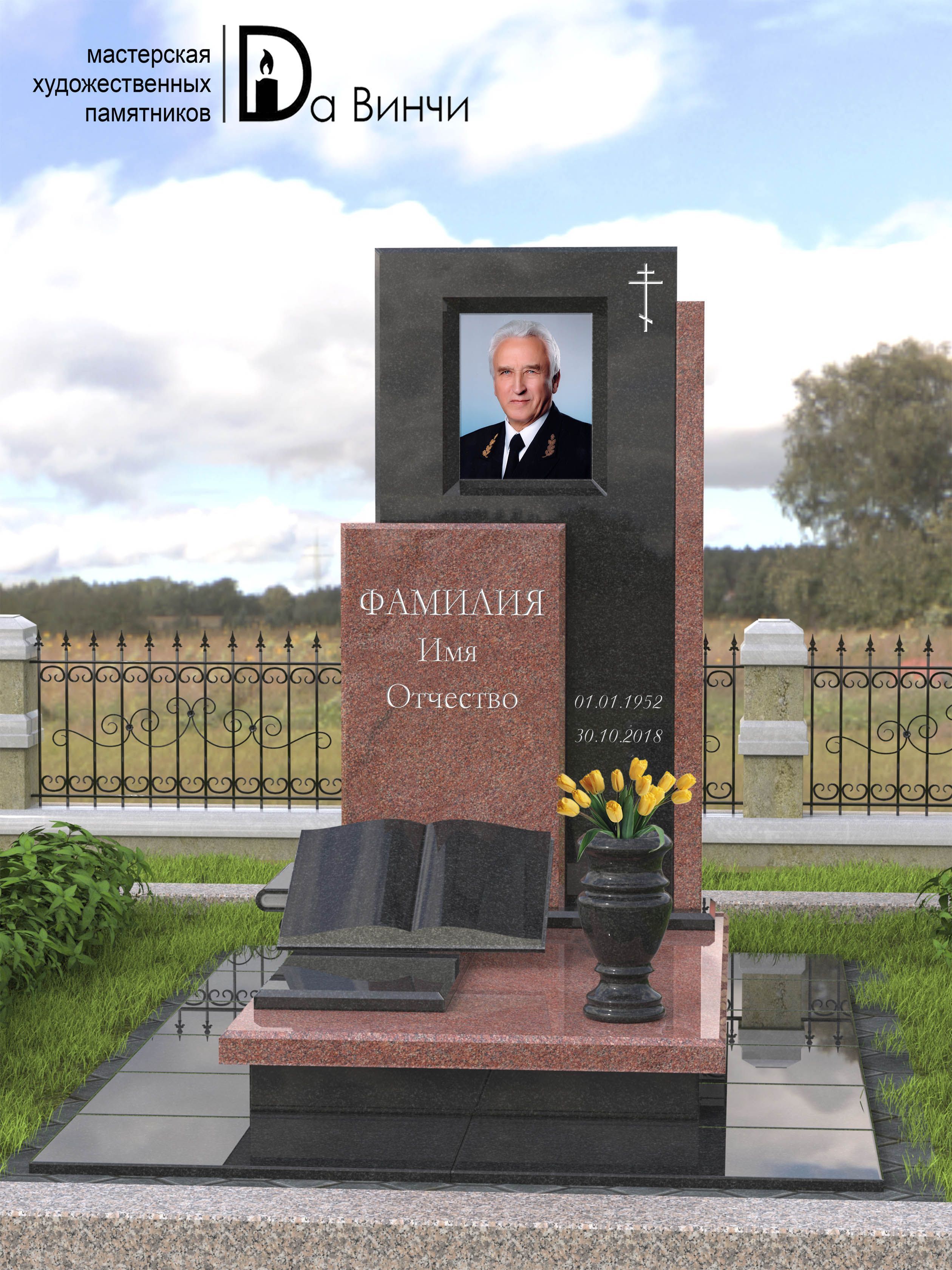 Памятник комбинированный из различных сортов гранита может быть изготовлен во множестве цветовых решений и сочетаний форм и размеров. Композиция составлена из трех прямоугольных стел. Надгробные плиты оформлены гранитной книгой под короткую эпитафию. Портретная стела представлена в черном граните Габбро-диабазе, как наиболее универсальном и удобном материале для размещения надписей и портретов. Цветные элементы выполнены в светло-красном граните Питкяранта, но могут быть предложены из натуральных материалов на выбор, таких как Аврора, Гранатовый Амфиболит, Дымовский, Мансуровский граниты, Балтик грин, Габбро-диабаз, Питкяранта (Сюскюянсаари), гранит «Возрождение» и Казахстанского камня Жельтау.