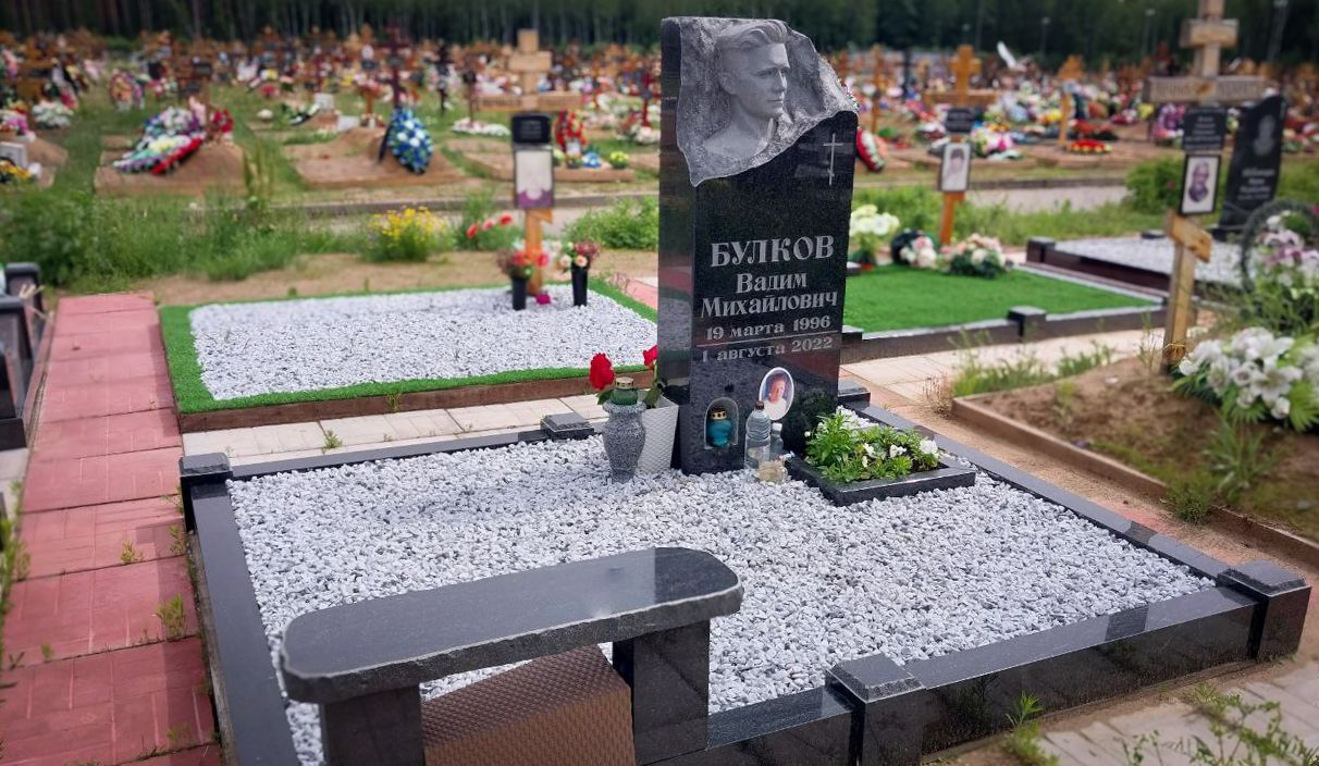 Под барельефом выгравированы имя «Бу́йков Вадим Миха́йлович», дата рождения «19 марта 1986» и дата кончины «1 августа 2022». Надпись чётким шрифтом расположена на гладкой полированной поверхности, создавая строгий контраст с рельефными фактурами портрета.