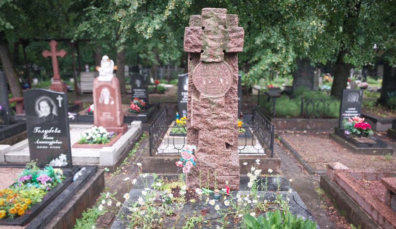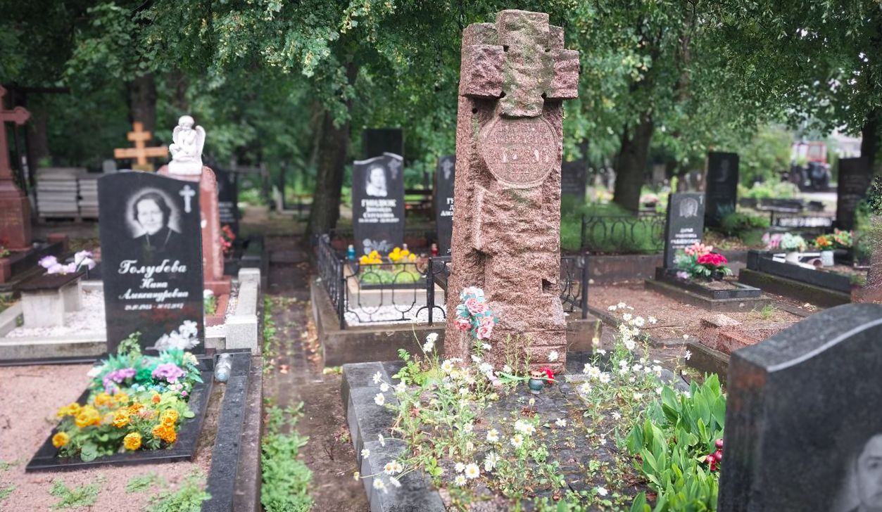 На заднем плане — тёмная стенка кустов и стройные стволы деревьев Большеохтинского кладбища, а по бокам виднеются соседние надгробия. Сочетание строгих гранитных форм и зелёного окружения создаёт умиротворённую атмосферу и подчёркивает значимость памяти.