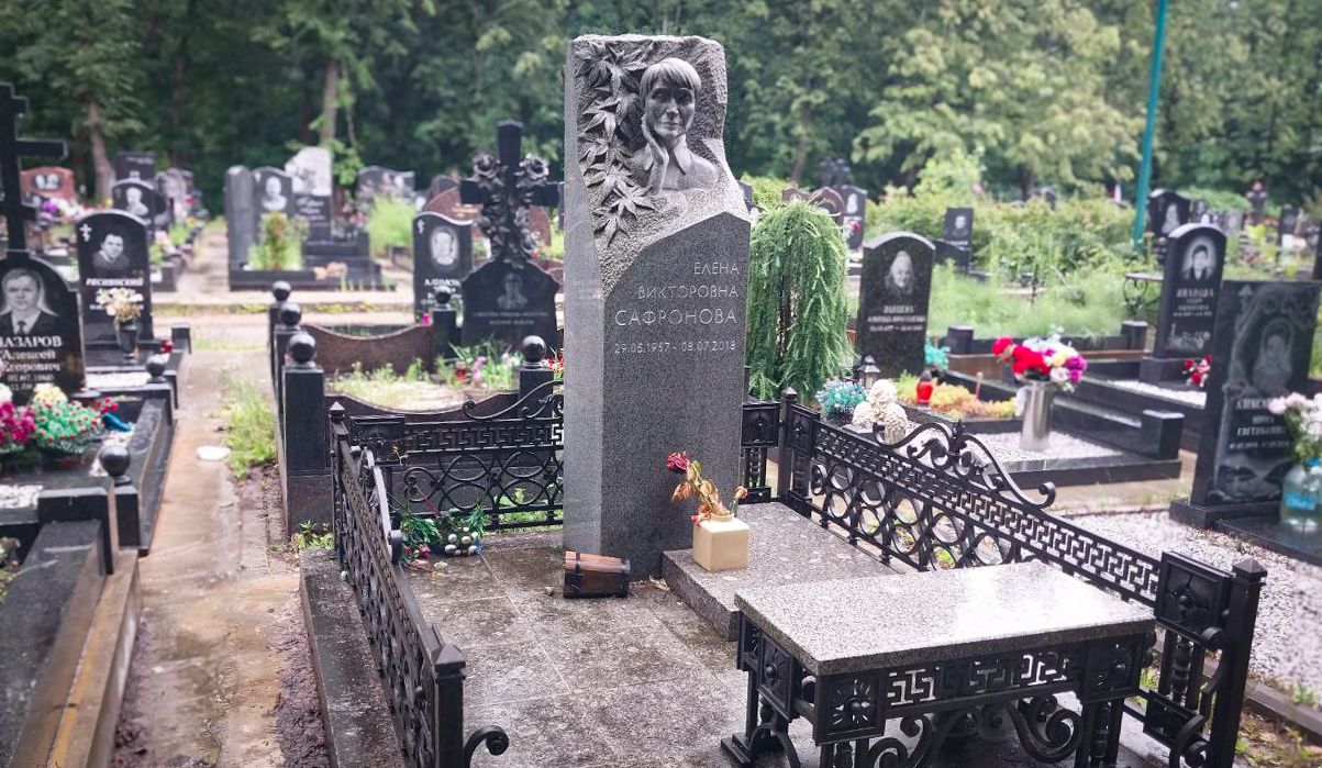 Ниже рельефа выгравировано имя «Елена Викторовна Сафронова» и даты жизни «29.05.1937 – 08.07.2018» чётким лаконичным шрифтом, подчёркивающим достоинство памятника. Глубокий контраст глянцевой поверхности и матовой текстуры рельефа создаёт выразительную игру света и тени — решение, характерное и для комбинированных памятников, где сочетаются разные фактуры обработки.