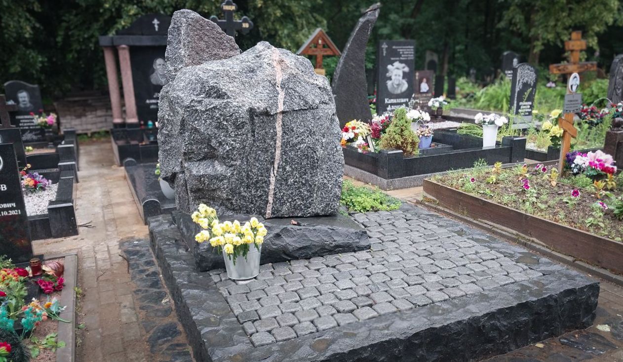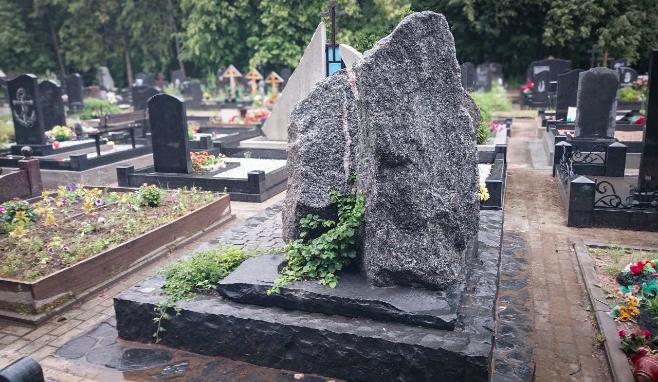 Мемориальный комплекс на Большеохтинском кладбище впечатляет первозданным величием природного камня и органично вписывается в окружающий ландшафт. Основой композиции служит массивный природный валун, установленный на надёжном бетонном фундаменте. Минимально обработанный гранитный поребрик без угловых столбов подчёркивает естественную форму камня и создаёт атмосферу необработанной силы и неподдельной простоты.