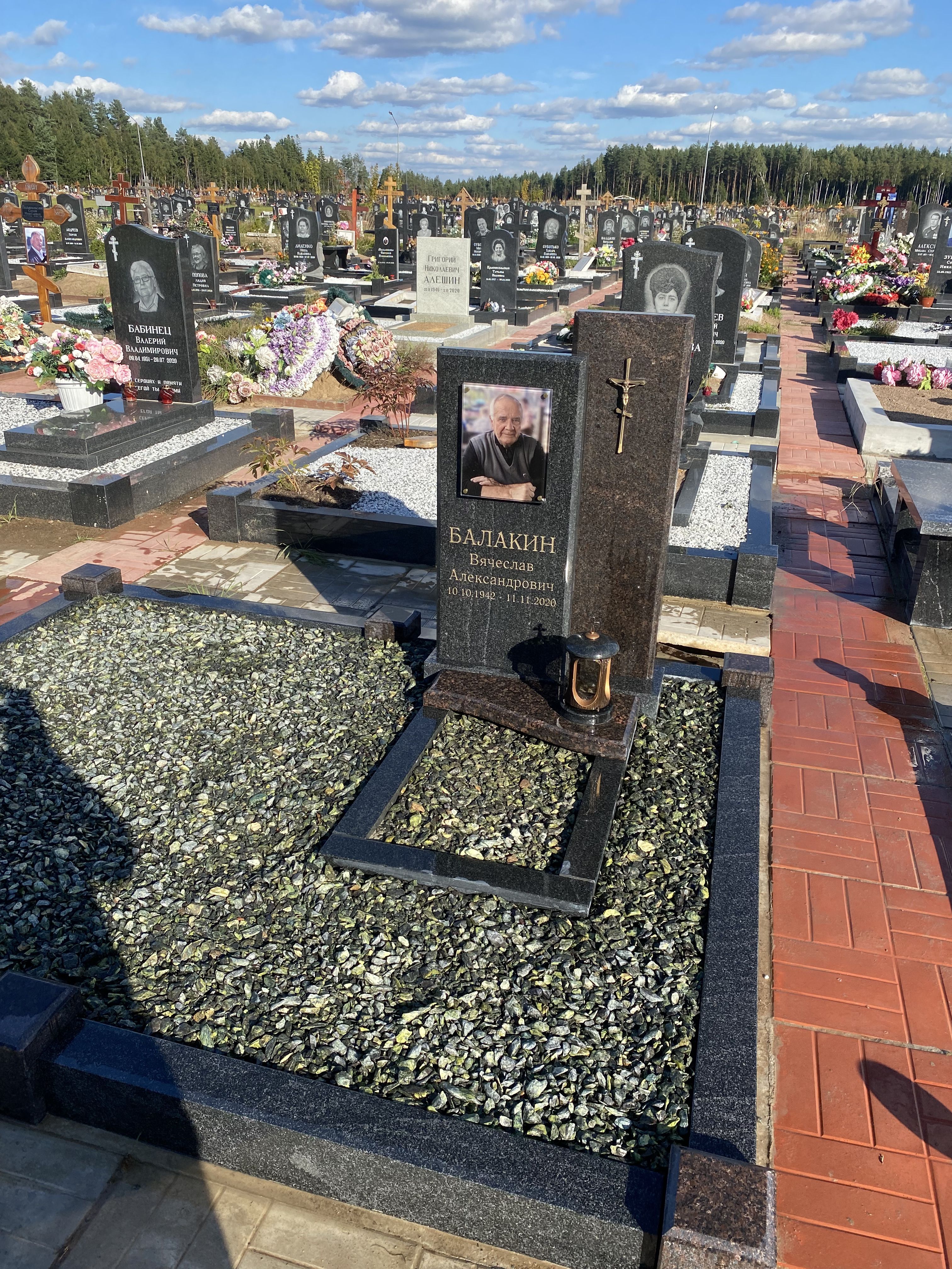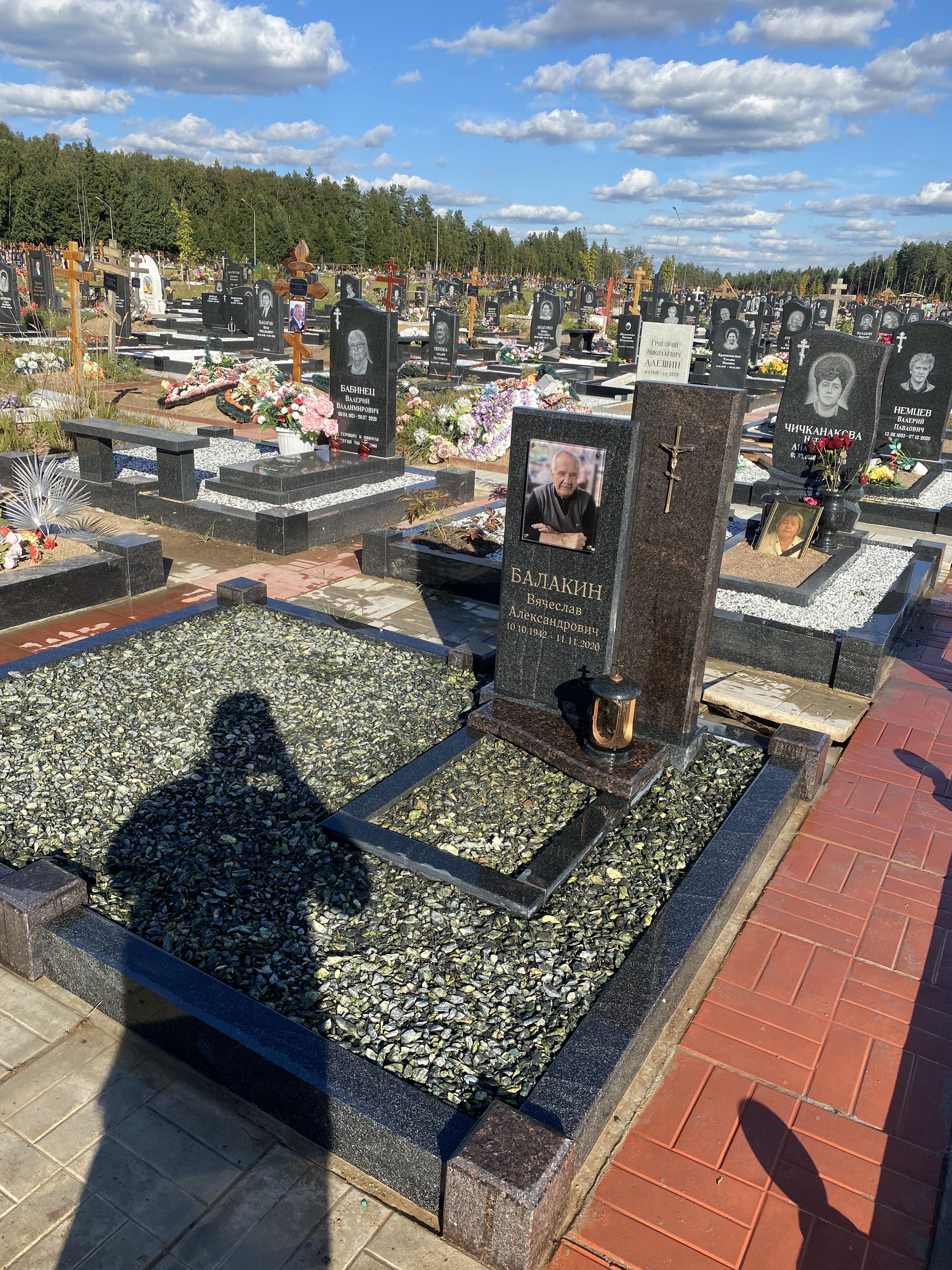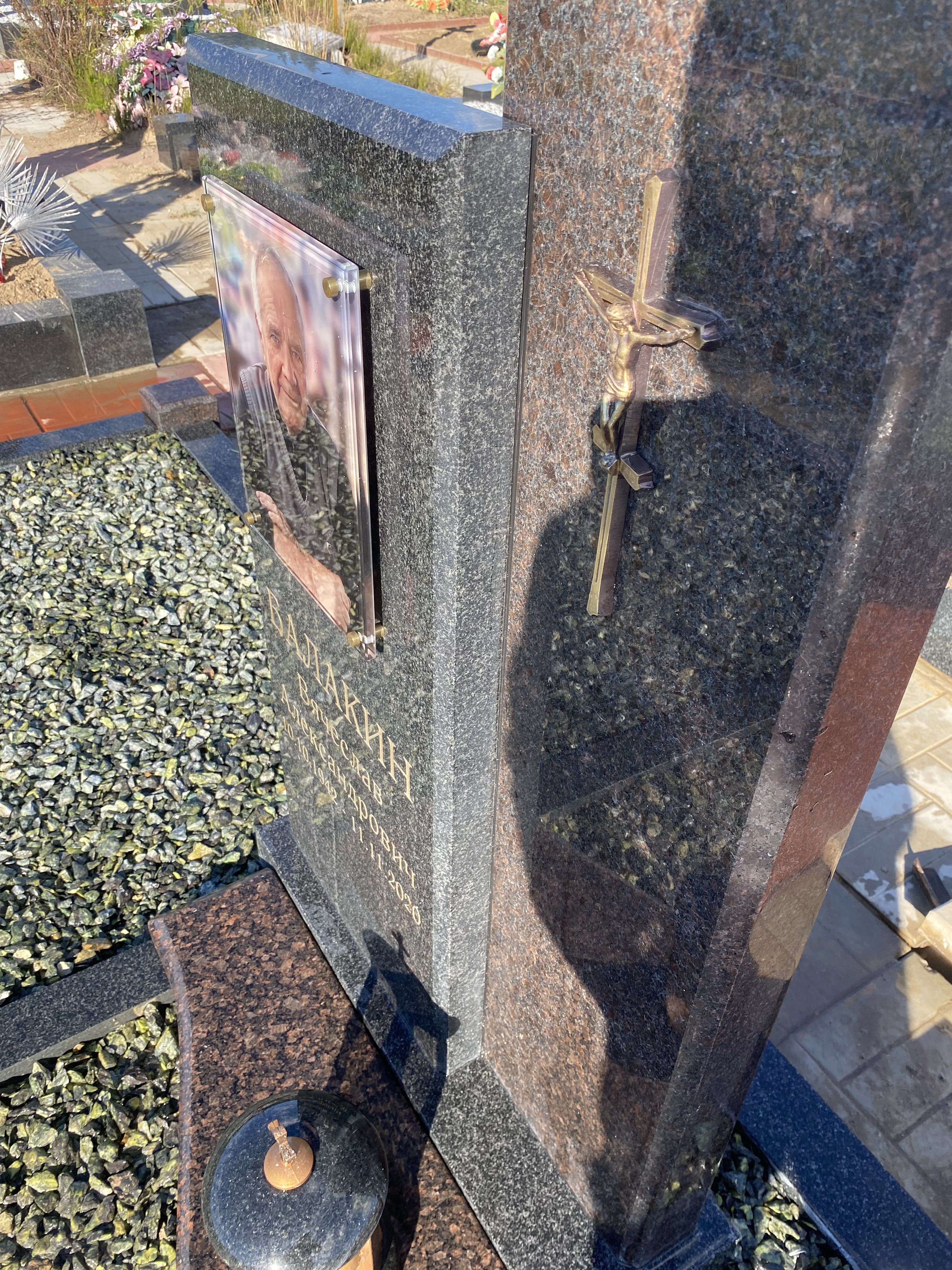 На Белоостровском кладбище установлен комбинированный гранитный комплекс, выполненный с использованием двух сортов натурального камня. Такой подход позволяет создать не только прочную, но и выразительную мемориальную композицию, подчёркивающую индивидуальность ушедшего и внимание к деталям. Контраст тёмного и светлого гранита делает памятник особенно запоминающимся и визуально уравновешенным.